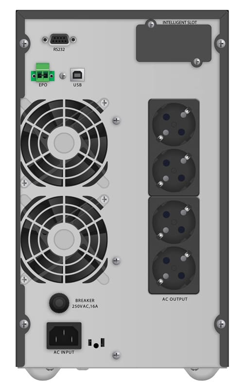 Информацию о текущем состоянии работы ИБП (напряжение, нагрузка, режим, заряд АКБ etc) предоставляет LCD-дисплей и звуковая сигнализация. Для подключения сетевых карт предусмотрен универсальный слот. Интерфейсы: USB, RS-232, EPO. Охлаждение — вентиляторное. Шум от работающего устройства не превышает 44 дБ. Корпус выполнен в черном цвете. Интервал рабочих температур — 0 С… +40 С, защита корпуса от пыли и влаги соответствует стандарту IP20. Габариты — 190*327*399 мм, масса — 17.4 кг.