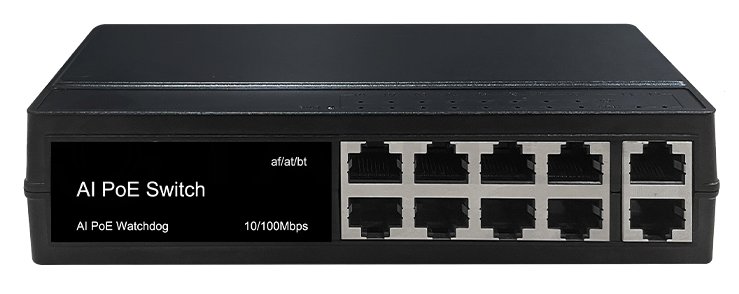 PoE коммутатор 8x100 Мбит/с PoE портов (6 портов 802.3af/at, максимальная мощность PoE 30Вт на порт, 2 порта 802.3af/at/bt, максимальная мощность PoE 60Вт на порт) + 2x100 Мбит/с порта Uplink, общий бюджет PoE 120 Вт, автоматический PoE watchdog, автоматический выбор длины линии и скорости работы (1 и 2 порт, до 130м скорость 100Мбит/с, от 130м до 250м скорость 10Мбит/с), встроенный блок питания, грозозащита и защита от статического электричества, от -30°С до +60°С.