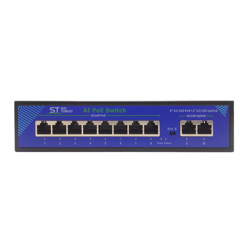 ST-S85POE(2M/96W/А) PRO, (версия 2), Switch POE 8-ми портовый для обеспечения проводных сетей напряжением 48В, защита от КЗ, Extend 250м., AI PoE, AI QoS, AI VLAN, Грозозащита, PoE порты: 8 х (10/100Мбит/с), UpLink порты: 2 х (10/100 Мбит/с), SFP порты: нет, Max.пропускная сп-ть: 100 Мбит/канал, Uвых: 48 (±10%), Р(ном) каждый порт (Вт): 12 Вт, Р(макс) каждый порт (Вт): 30 Вт, Р(сумм) общая (Вт): 96 Вт, Тип РоЕ: А, Коммутационная способность (Гбит/с): 1,6 Гбит/с, AI PoE(watchdog)/Vlan/Extend/QoS, Система охлаждения: пассивная, МЕТАЛЛ, Температура эксплуатации: От -45°C до +55°C, Габаритные размеры ИП: 270х140х44 мм