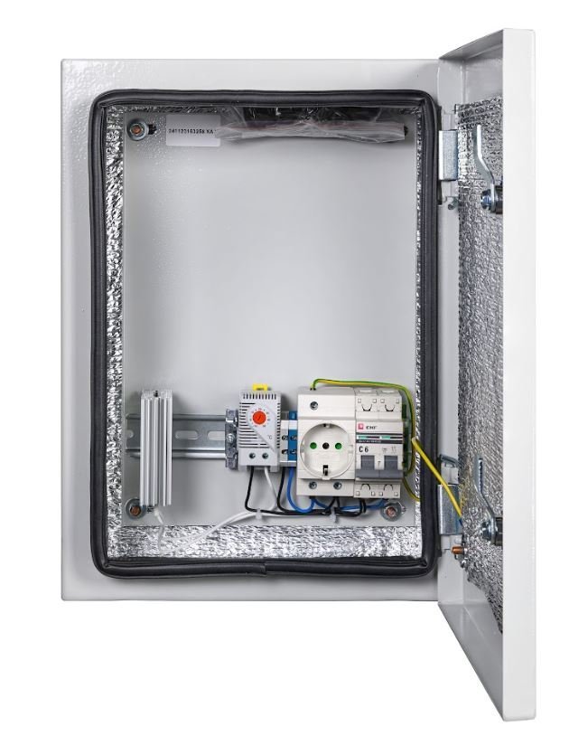 Шкаф климатический навесной с монтажной платой; 2 гермоввода (MG-25); внутренние размеры 277х377х190 мм (ШхВхГ); IP66, t-раб.-55…+50°С, 300х400х220 мм (ШхВхГ), 7.1 кг. Цвет серый. Комплектация: утеплитель из порилекса, замок 2 шт, ключ 1 шт, розетка 1 шт, автоматический выключатель 6А 1 шт, клемма для подключения оборудования 2 шт, клемма заземления 1 шт, термореле 1 шт, нагреватель 50 Вт 1 шт.