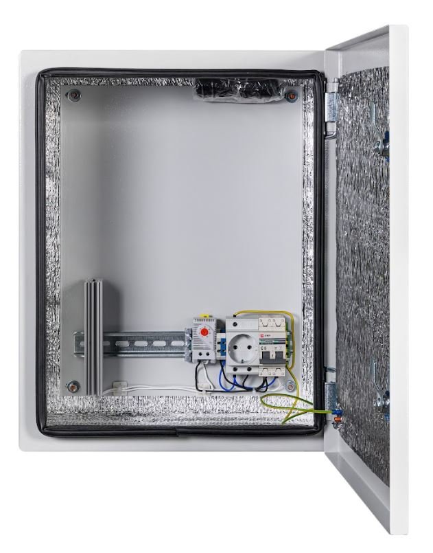 Шкаф климатический навесной с монтажной платой; 2 гермоввода (MG-25); внутренние размеры 377х477х220 мм (ШхВхГ); IP66, t-раб.-55…+50°С, 400х500х250 мм (ШхВхГ), 10.8 кг. Цвет серый. Комплектация: утеплитель из порилекса, замок 2 шт, ключ 1 шт, розетка 1 шт, автоматический выключатель, 6А 1 шт, клемма для подключения оборудования 2 шт, клемма заземления 1 шт, термореле 1 шт, нагреватель мощностью 100 Вт 1 шт.
