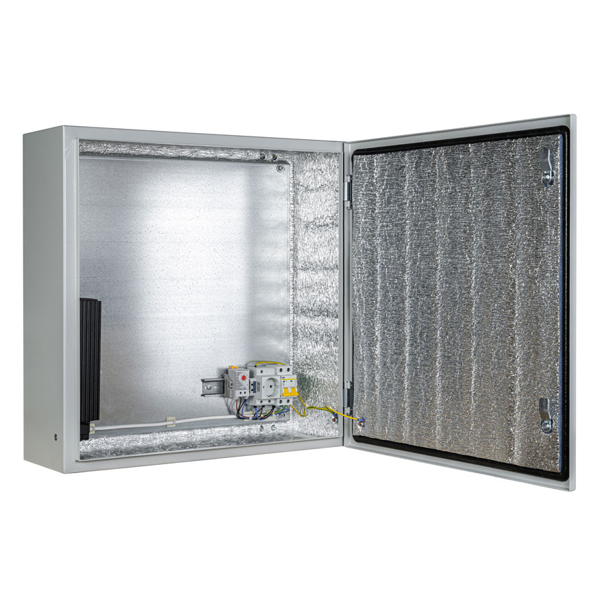 Корпус шкафа изготовлен из стали и имеет степень защиты IP66, что обеспечивает его полную защиту от пыли и струй воды. Шкаф оборудован системой обогрева и окрашен в серый цвет.