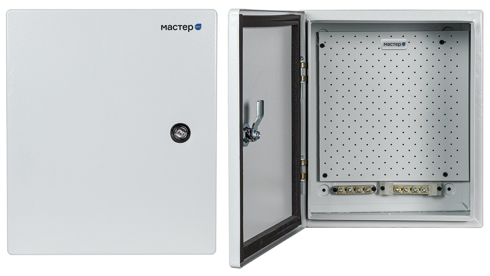 Корпус металлический уличный с монтажной платой; IP54, 390х290х180 мм. В комплекте: замок, ключ, 2 клеммные рейки, уплотнительная прокладка, 2 гермоввода.