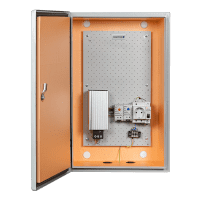 Шкаф укомплектован DIN-рейкой, DIN-розеткой с заземлением, двумя гермовводами MG-25, клеммной колодкой, системой обогрева. В систему обогрева входят обогреватель HG 140 мощностью 75 Вт. автоматический выключатель 10 А, нормально закрытое термореле KTO 011, нормально открытое термореле KTS-011 (защита от холодного старта). Диапазон регулировки температур включения обогревателя и мягкого старта — –10 °С… +50 °С.