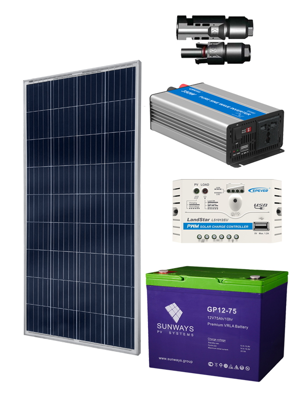 Комплект состоит из солнечного модуля FSM-100M, инвертора Cotek S300 12В, контроллера EPSolar LS1012E, АКБ OSB 72Ah AGM 12V, коннекторов солнечных модулей МС4.